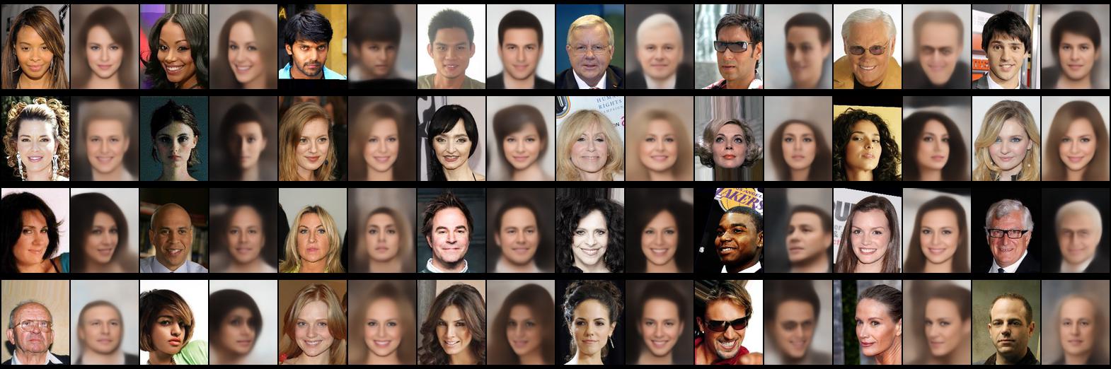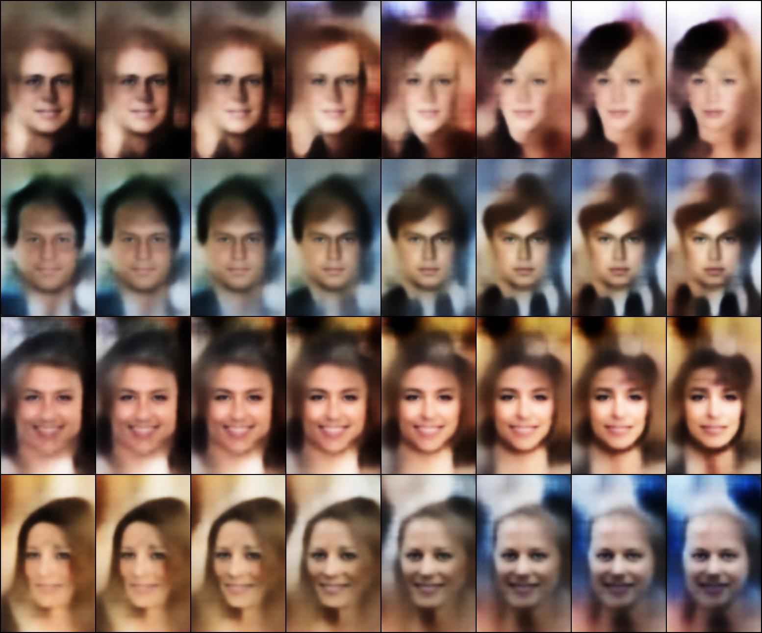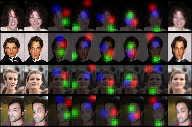 I re-implemented the paper Unsupervised Learning of Object Landmarks through Conditional Image Generation by T. Jakab. Supervised landmarks are "interesting points" in images. In portraits that's normally eyes, nose, mouth, chin and so on. The model described in the paper is unsupervised though, so it decides itself which points are interesting. It converges to its own set of landmarks, e.g. just above the left eye, just a bit right from the nose. But the essential is that the discovered landmarks are consistent and could be used to regress other sets of landmarks, as described in the paper. I didn't do that, but I verified the information contained in the unsupervised landmarks by generating faces conditioned on the unsupervised landmarks alone. That's not a prove that the landmarks are "consistent", but it shows the amount of information contained in the landmarks. I decided to use 15 landmarks in these experiments.