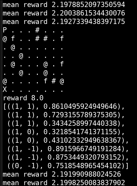 P is the player. X is the goal. @ are the traps. f is food, and # are walls. Reaching the goal gives 10 score. Every collected food 0.5. Hitting a trap gives -10 reward and ends the episode.