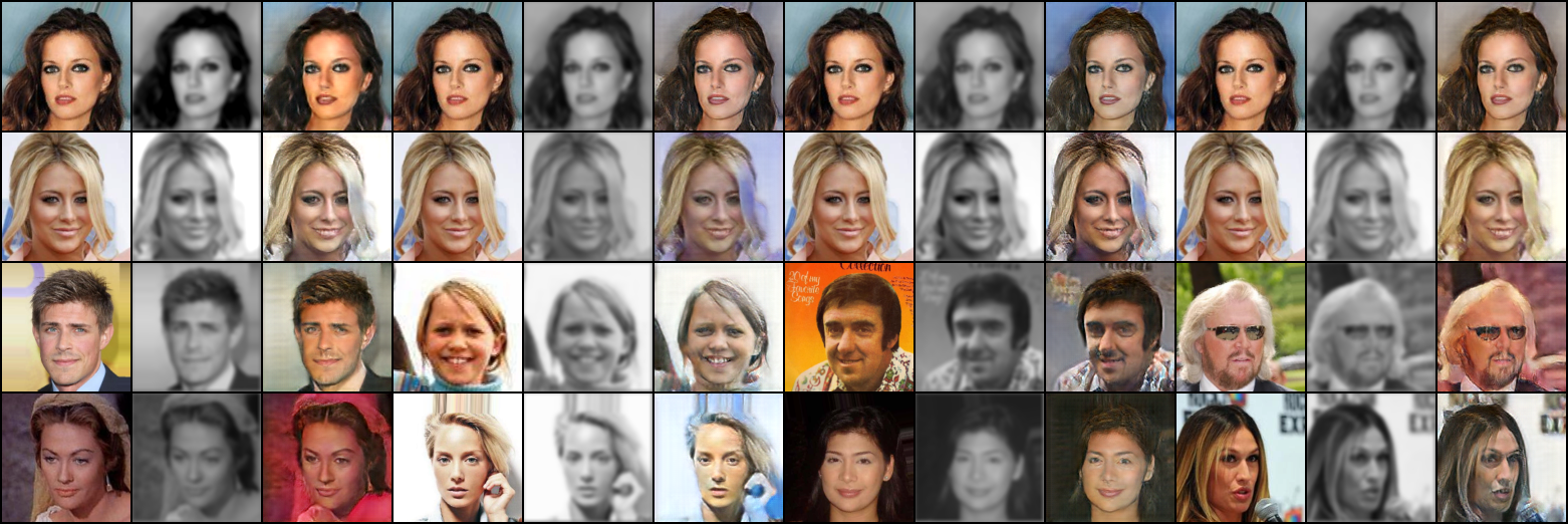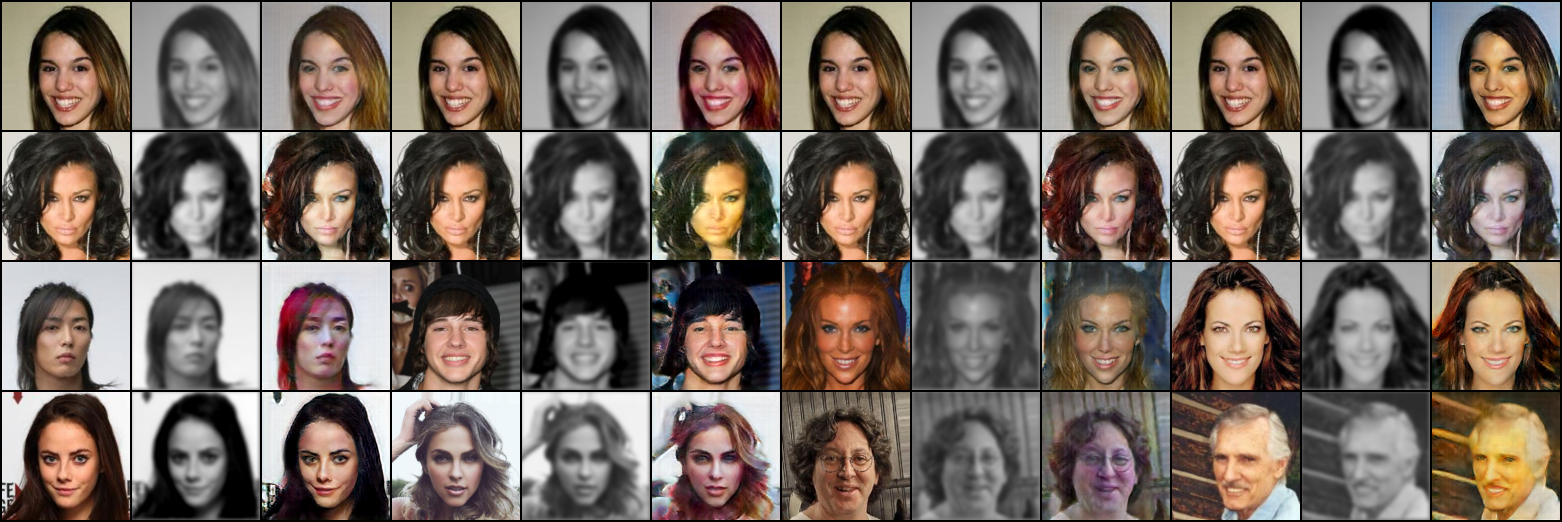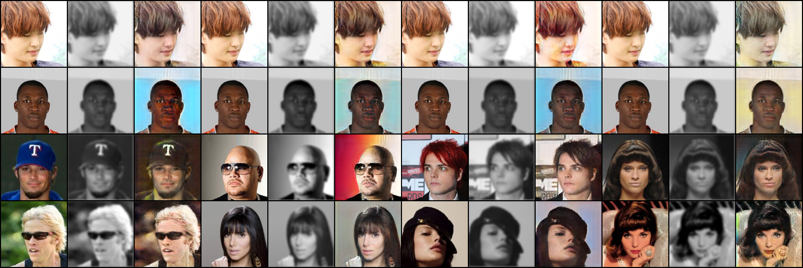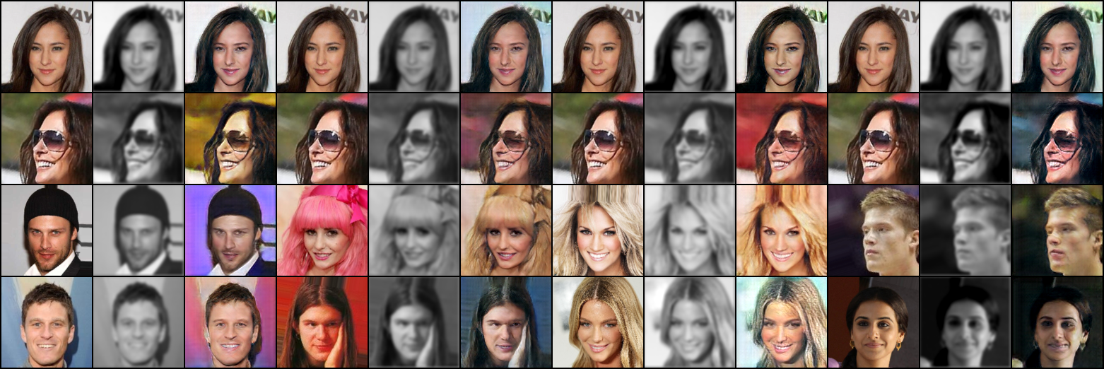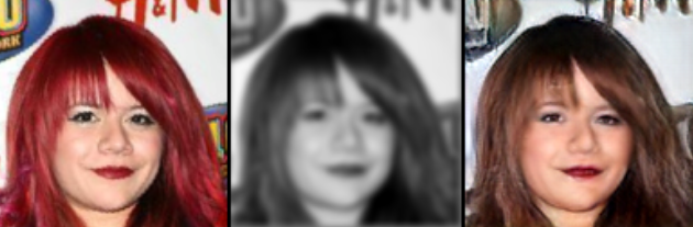 I've used the CelebA dataset again to repair perturbed portraits. This time I blurred the photos, turned them grayscale, and modified the brightness randomly. The repair network was the generator in an adversarial setting. Beside a per pixel MSE loss I've mixed in the backpropagated gradient from a discriminator network.
